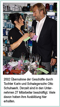 Durch den Umbau im Jahre 2003 ist das Angebot für den Kunden nicht nur räumlich gewachsen, jetzt darf man auch nach Lust und Laune selber auswählen und probieren. Und das bei einem Angebot, das, wie die Chefin betont, dem in der Großstadt in nichts nachsteht. Beinahe alle Marken aus dem Duft- und Pflegebereich gibt es in dem attraktiven Geschäft. Gesichts- und Körperpflege- produkte, ebenso dekorative Kosmetik (Maquiallage). Und hier kann man sich nicht nur beraten lassen, sondern auch von den beiden Kosmetikerinnen und sechs ausgebildeten Visagistinnen verwöhnen lassen und bei der Hautpflege entspannen. Aber auch die Herren- u. Damenwäsche hat ein neues Plätzchen im Geschäft, wo sie jetzt noch besser zur Geltung kommt. Mode der Marken LeJaby und Calvin Klein runden das Boutique- Sortiment ab.