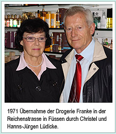 1959 begann die Geschichte der Parfümerie Lüdicke. Damals gründete der Drogist Hanns-Jürgen Lüdicke zusammen mit seiner Frau Christel das erste Geschäft in Pfronten. Zwölf Jahre später übernimmt er dann die Drogerie Franke in Füssen und im Juli 1980 das Schlosscafe im Herzen der Reichenstraße, wo eine Drogerie entsteht.